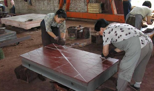 鑄鐵平臺需要機床加工配合人工刮研才可以達到高精度刮研是人工利用刮刀鏟刮,使工件達到規定精度的加工方法。廣泛應用于機器和工具的制造及機械設備的修理工作。人工刮研常見的平面維修方法,通過刮研的方法降低表面的粗糙度值,提高接觸精度和幾何精度。僅僅依靠機床加工是無法達到高精度的,必需要配合人工刮研工藝。