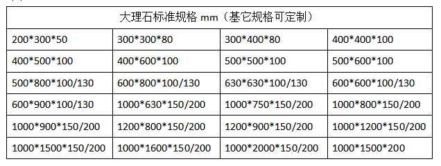 大理石平臺在工廠檢驗、測量,實驗室實驗等方面都適用,大理石平臺一般規(guī)格從200*200到2000*4000mm不等,我們有自己的標準規(guī)格(見圖1)。有時候客戶需要的尺寸并不是標準規(guī)格,就需要定制,這時候會有客戶考慮說定制大理石平臺是不是比標準的價格高,其實并不是這樣的。大理石平臺的加工是先采用鋸床切割出適合的尺寸,然后經(jīng)過人工研磨制成的。不管是標準規(guī)格還是定制規(guī)格,它們的加工工序都是一樣的,像不需要打孔開溝槽的大理石平臺,石料我們是按方算的,而人工研磨的費用是按平方算,所以定制的大理石平臺價格并不高。如果是定制打孔的大理石平臺,那價格就會用變化了,這時候就需要按孔的大小,孔位精度的要求,還要孔的數(shù)量來核算價格。還有一點就是材質(zhì)的選擇,如果要定制濟南青材質(zhì)的大理石平臺,那價格就要按濟南青石料來算價格。
